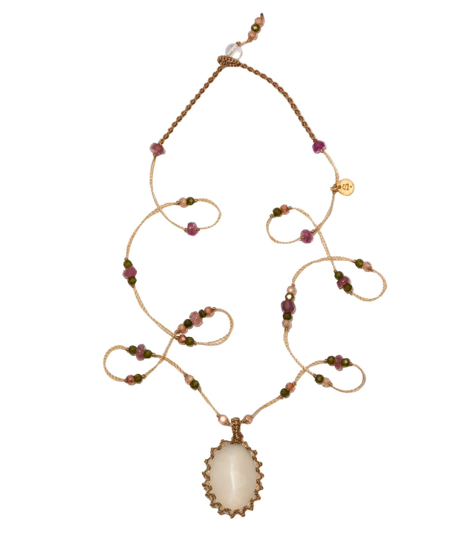 The Moon Stone pendant, nestled in a resistant beige thread, is accompanied by a mix of emerald and zirconium pearls.