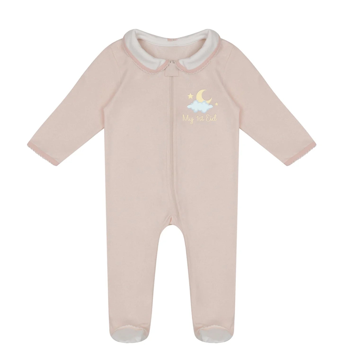 Embrace the magic of your baby's First Eid and Ramadan with our exclusive Organic Cotton Sleepsuit. This special garment is crafted with the purest organic cotton and adorned with a delicate crescent moon design – a celestial touch for your little one's joyous journey.